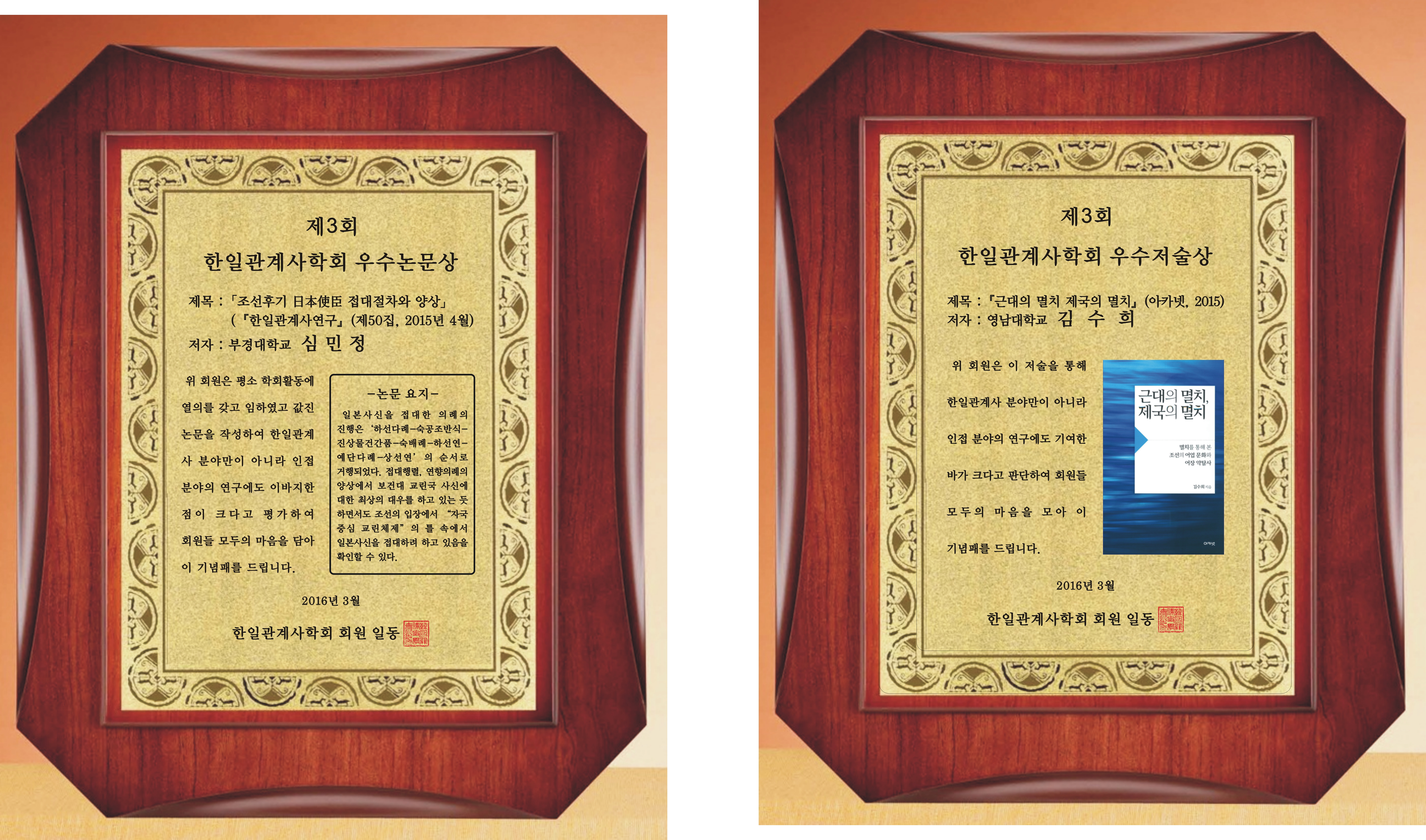논문상은 심민정 선생님, 조선후기 日本使臣 접대절차와 양상(한일관계사연구 제50집, 2015.4)이었습니다.