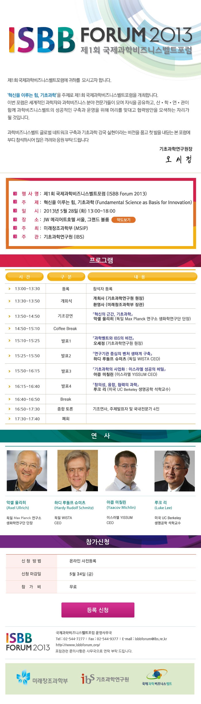 3. 우리 원은 국가 창조경제 실천의 핵심거점으로서 과학벨트를 성장시켜 가기 위한 비전을 공유하고, 기초과학연구 및 사업화에 관련한 정보 교류 및 지속적인 글로벌 협력체제를 구축해 나아가고자 ‘제1회 국제과학비즈니스벨트포럼(ISBB Forum 2013)’을 개최하게 되었습니다.