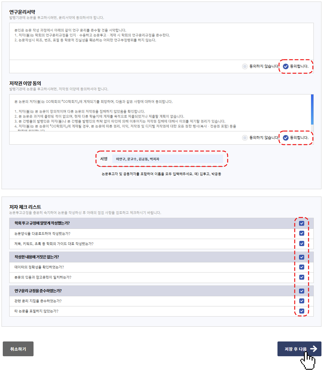 4. 서명란에 모든 저자의 이름을 입력합니다.