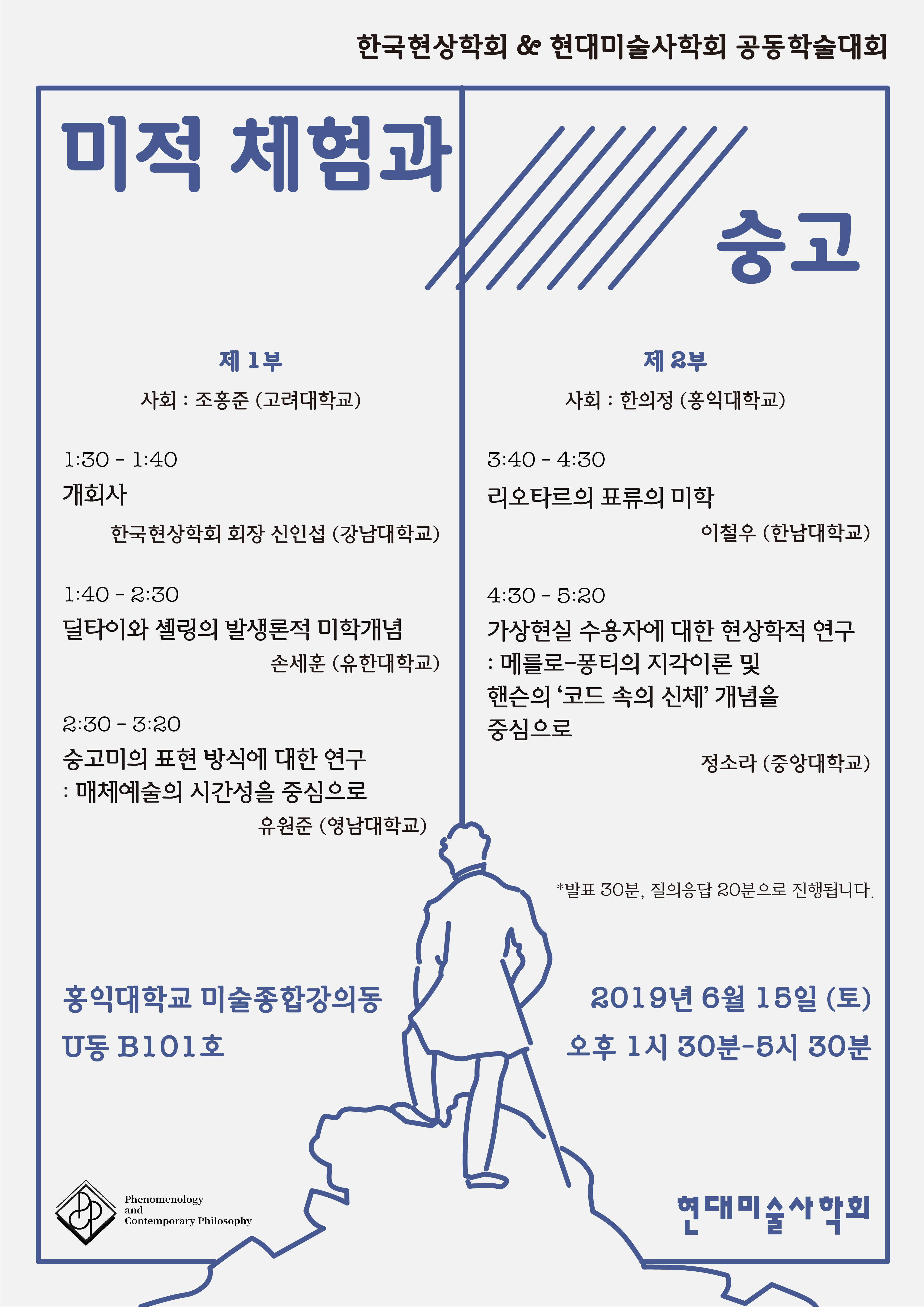 전반기 마지막 콜로키움은 현대미술사학회와 공동으로 주최하게 되었습니다. 프로그램을 보시면 아시겠지만 이번 발표회는 셸링, 딜타이, 리오타르, 메를로퐁티라는 19~20세기 미학과 현상학의 대철학자들이 대거 등장하는 아름다운 기획입니다. 4분의 선생님들이 준비한 연찬을 마음껏 누리시길 바라는 마음으로 초대하고자 합니다. 덧붙여 우리 현상학회는 이러한 콜로키움 이외에도 향후 세미나를 통해 르네 지라르의 눈으로 문화의 심층을, 로마노 마리용 리쉬르의 현상학으로 새로운 지평을 소개할 것이고, 또 기본소득(Basic income)에 대한 철학자들의 견해를 밝히는 토론을 개최함으로써 현상학의 세계개방 이념이 무엇인가를 실질적으로 이해하고자 합니다. 조만간 시작되는 여름휴가 동안 선생님들의 평안을 기원합니다.