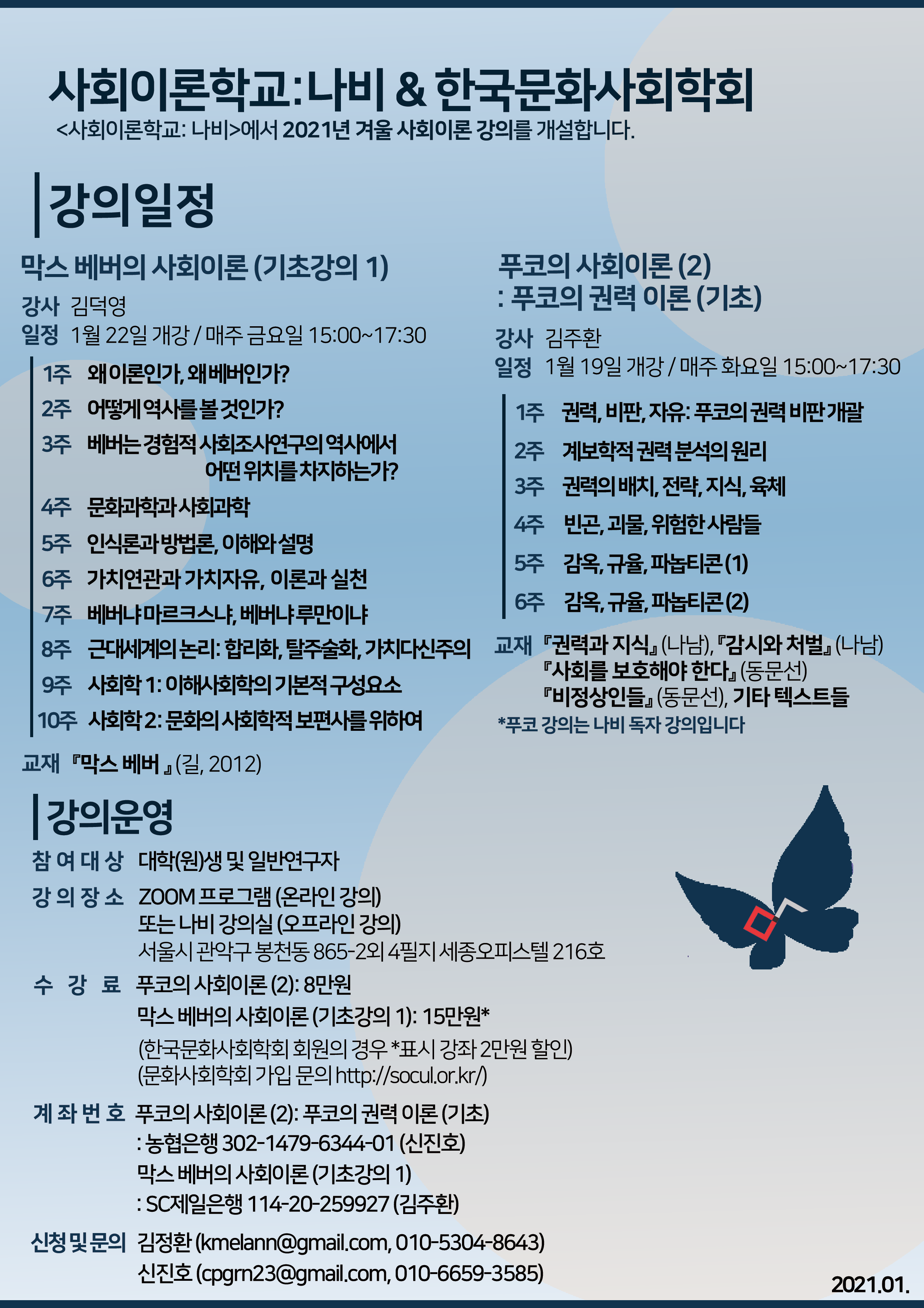 지난 해에 이어 <한국문화사회학회>는 <사회이론학교:나비>와 함께 오는 2021년 1월 22일부터 사회이론강의를 기획하고 진행합니다.