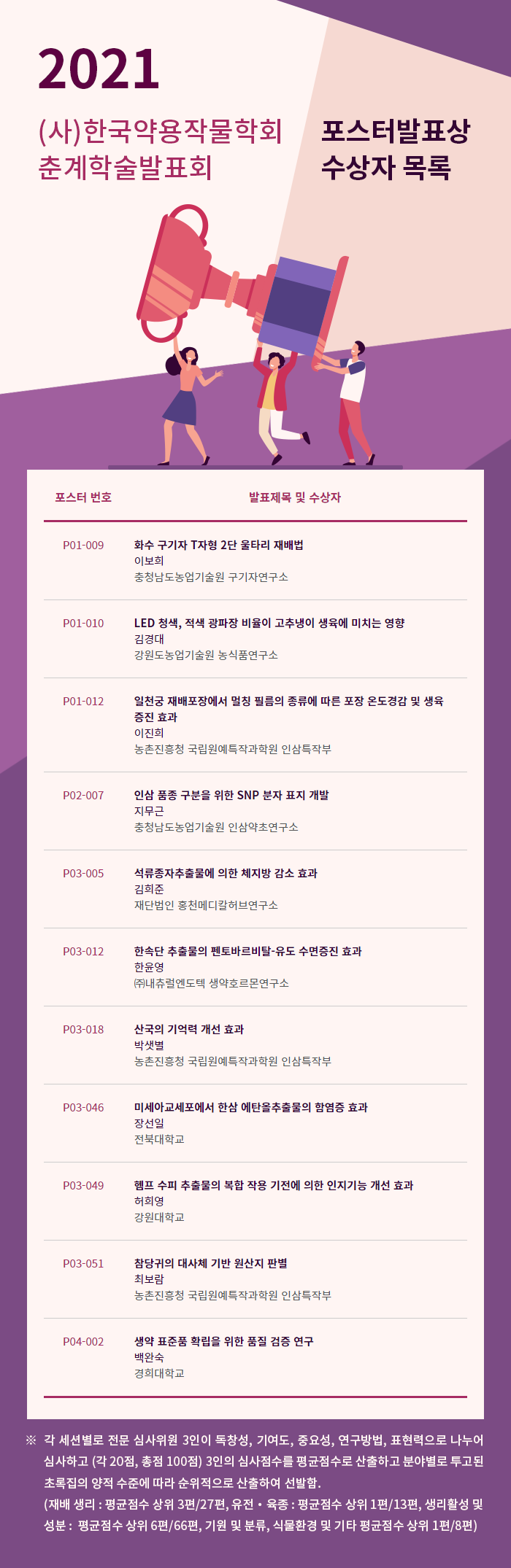 2021년 (사)한국약용작물학회 춘계학술발표회 포스터발표상 수상자 선정