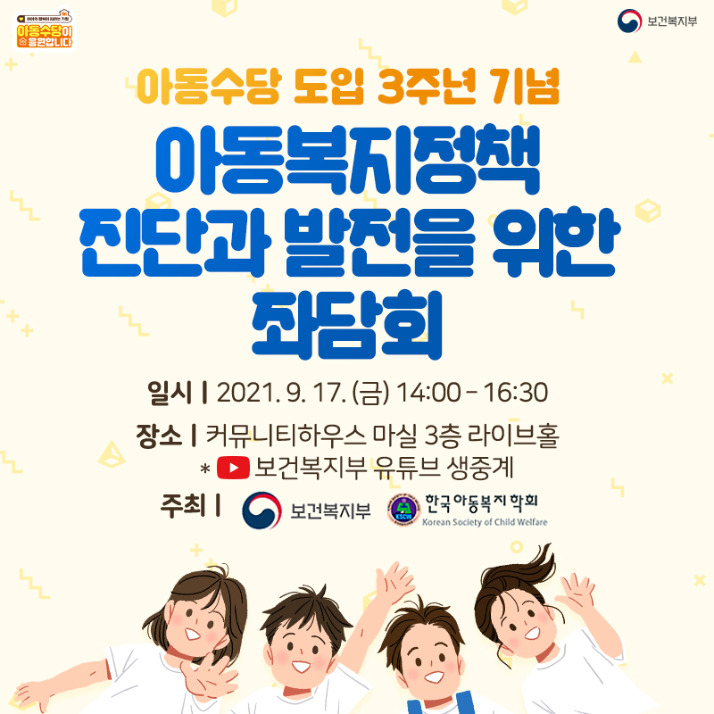 ‘아동복지정책 진단과 발전을 위한 좌담회’가 9월 17일 오후 2시에 개최됩니다.