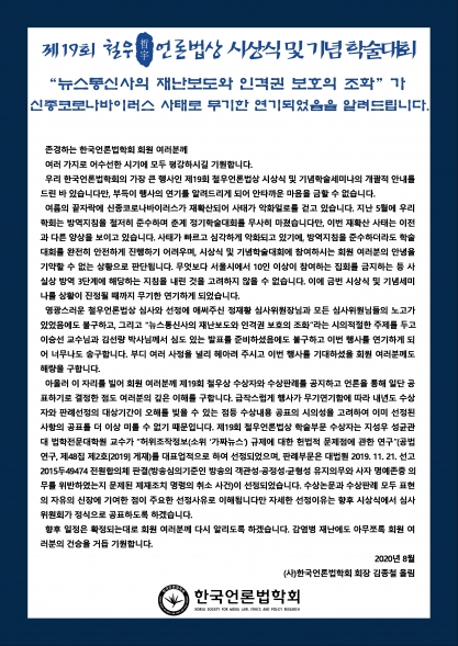 제19회 철우언론법상 시상식 및 기념 학술대회 무기한 연기