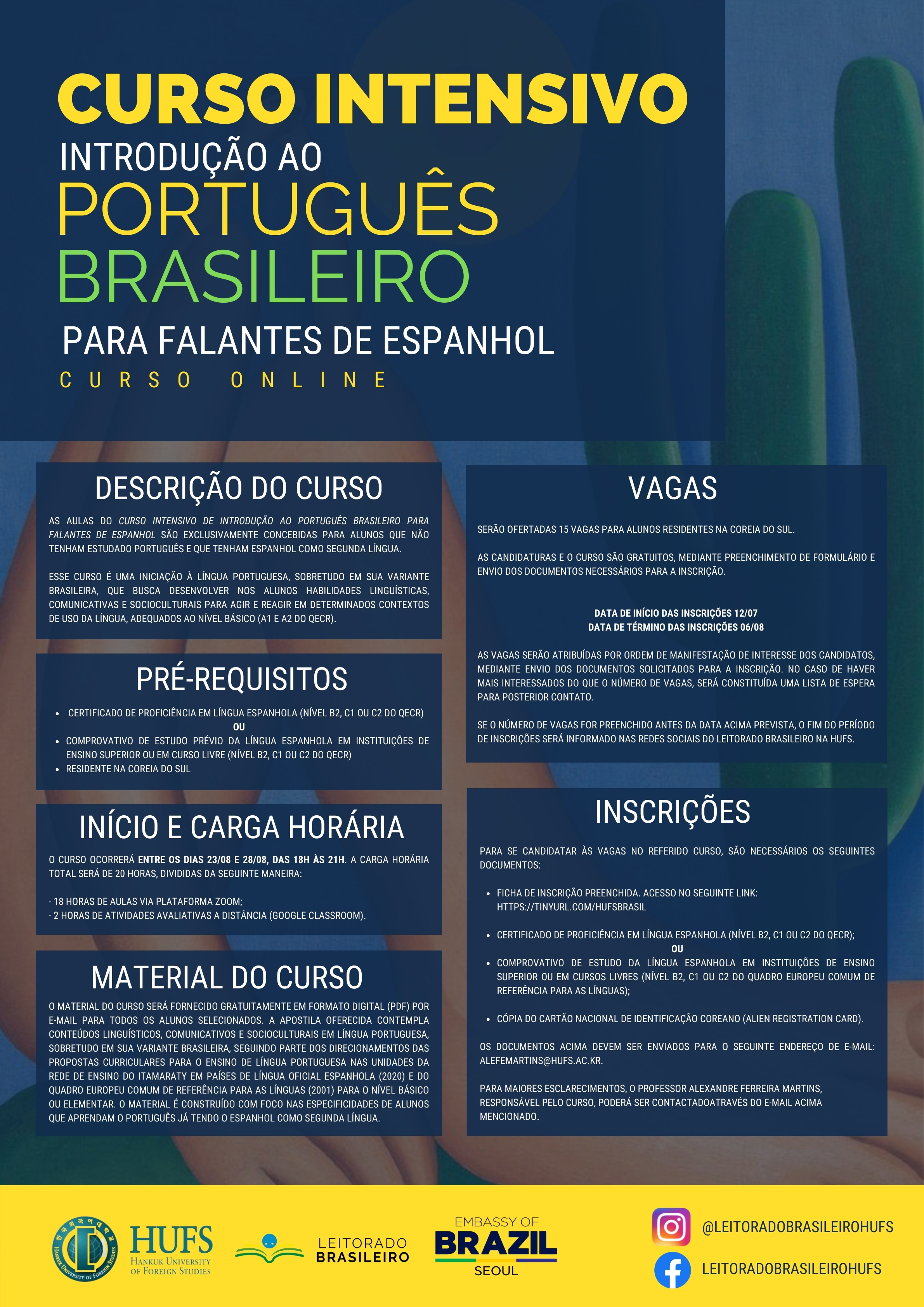 한국외국어대학교 포르투갈어과는 주한 브라질대사관과 공동으로 2021년 여름 방학에 스페인어 전공 학생을 대상으로 아래와 같이 브라질식 포르투갈어 입문 집중 과정 (온라인 과정)을 개설해 운영할 계획입니다. 관심있는 학생들의 많은 참여 부탁드립니다.