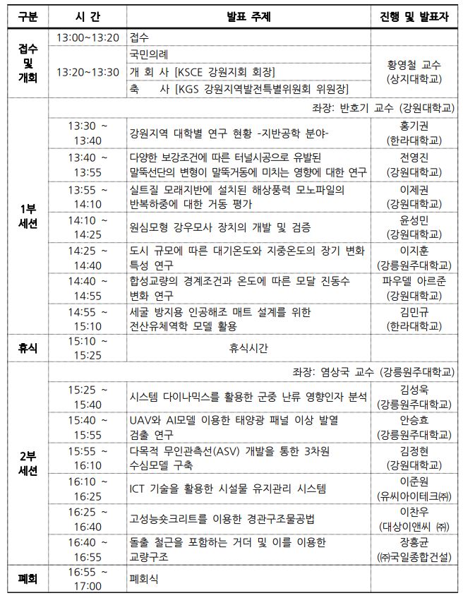 이번 학술발표회에서는 지반공학의 융복합 연구 발전을 위해 강원지역에서 수행하고 있는