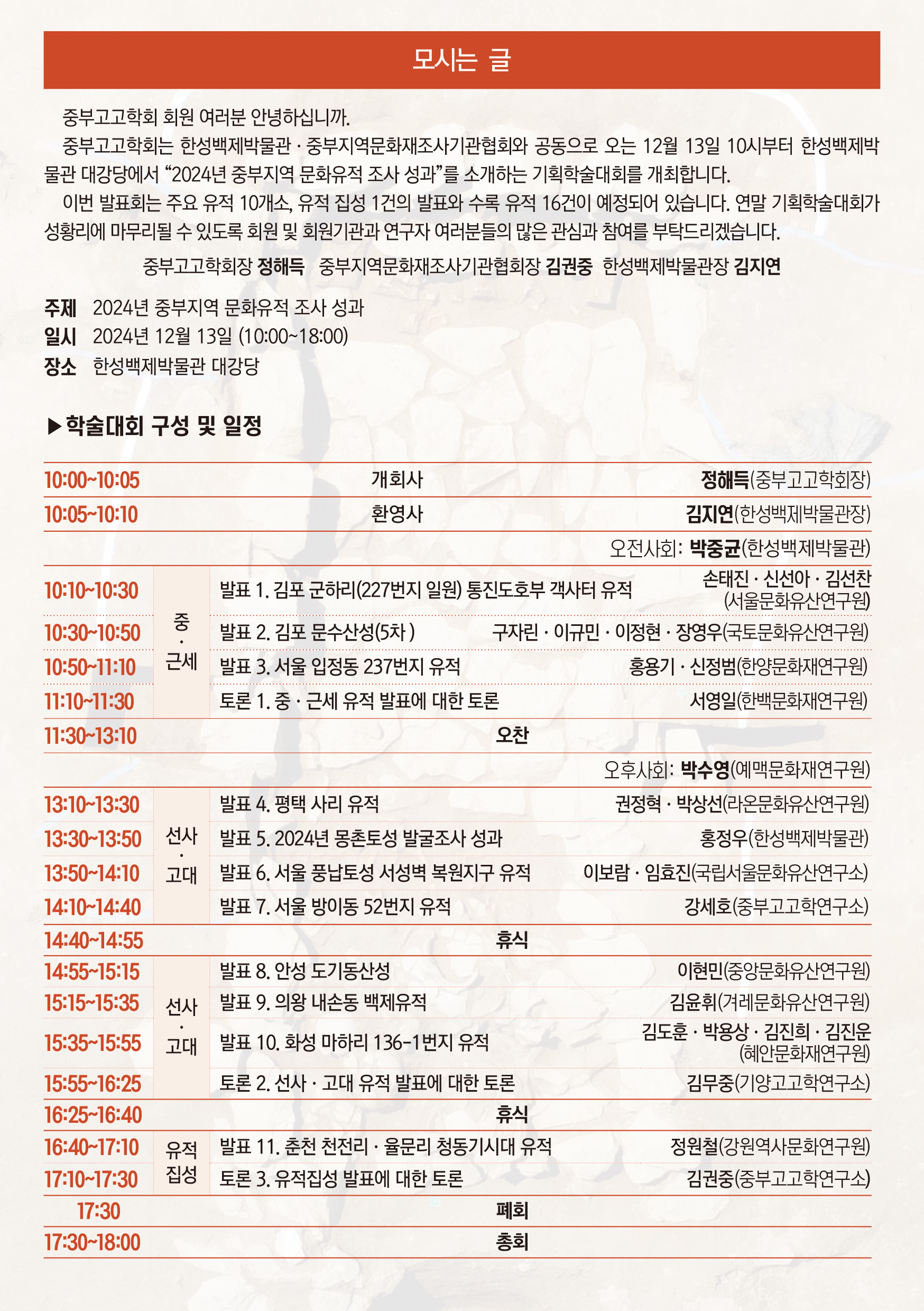 중부고고학회는 한성백제박물관·중부지역문화재조사기관협회와 공동으로 오는 12월 13일 10시부터 한성백제박물관 대강당에서 “2024년 중부지역 문화유적 조사 성과”를 소개하는 기획학술대회를 개최합니다.