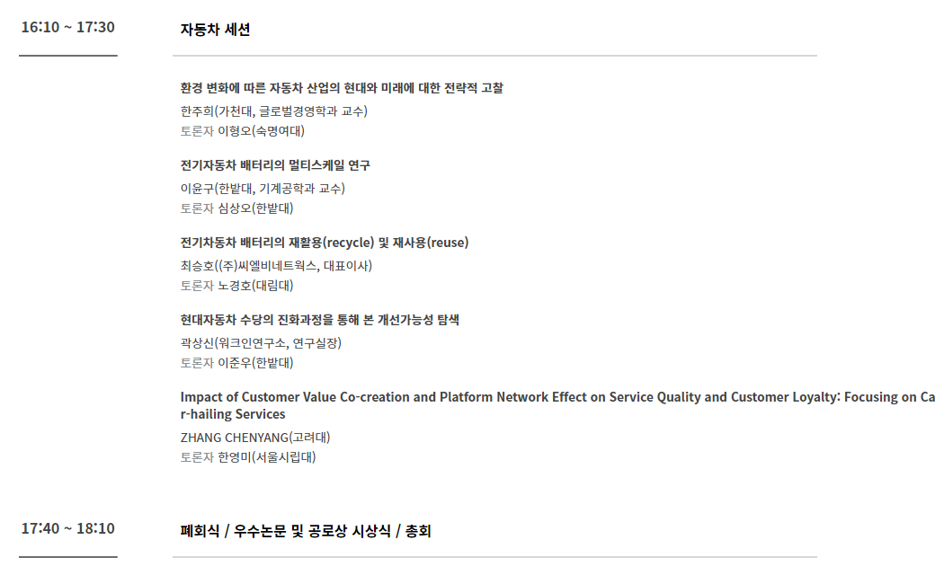 공공기관인 한국관광공사에 대한 생산성 CEO 대상 시상식, 그리고 학술발표 세션들(K-Culture 세션, 자동차시장 세션, 일반발표 세션 등)이 진행됩니다.