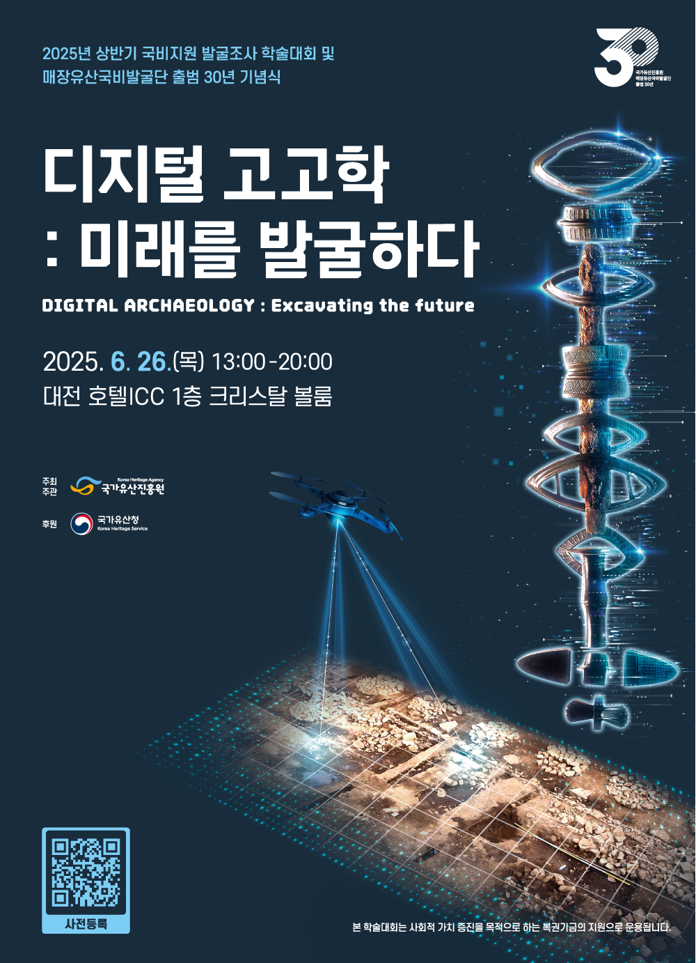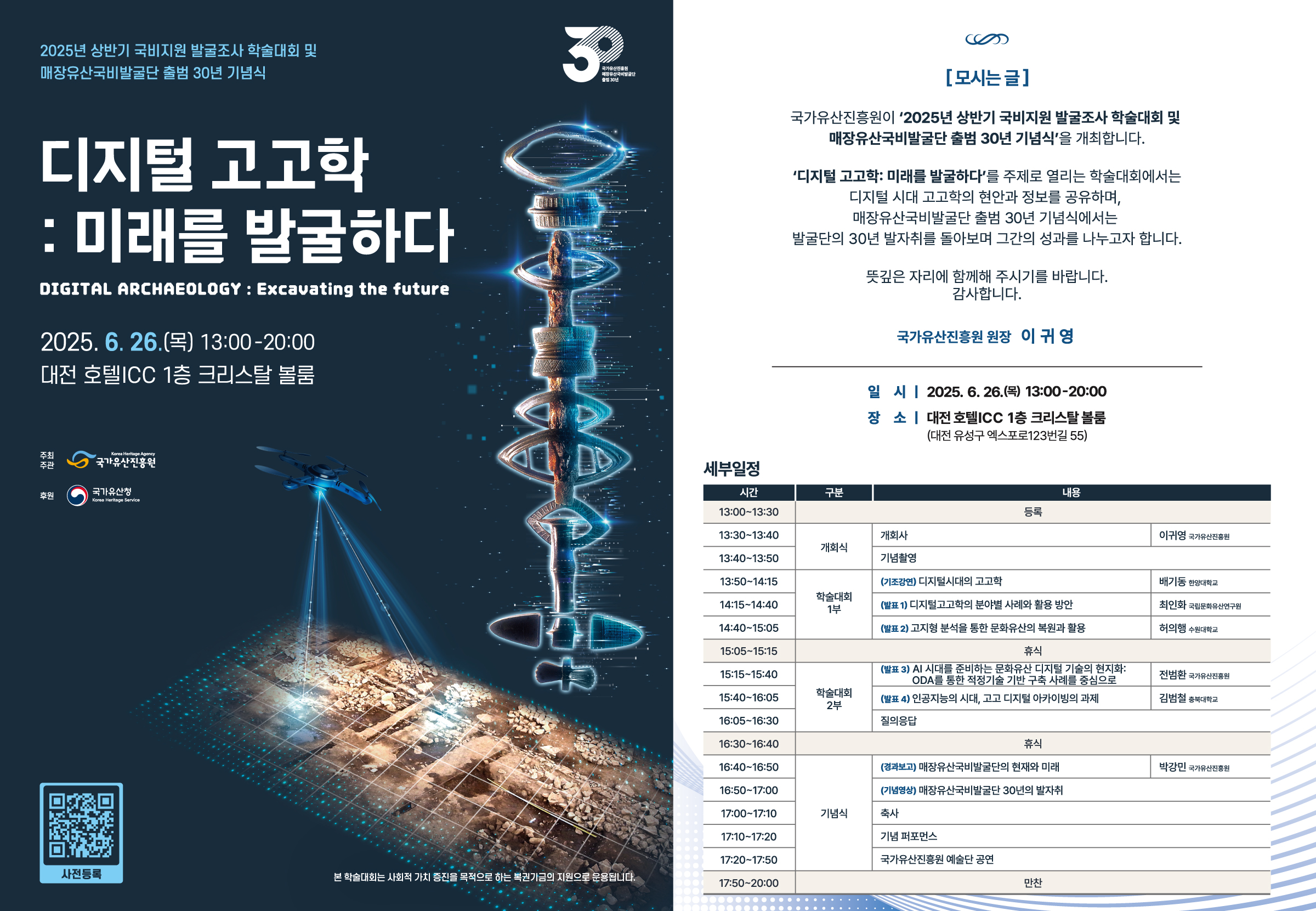 국가유산진흥원이 '2025년 상반기 국비지원 발굴조사 학술대회 및 매장유산국비발굴단 출범 30주년 기념식'을 개최합니다.