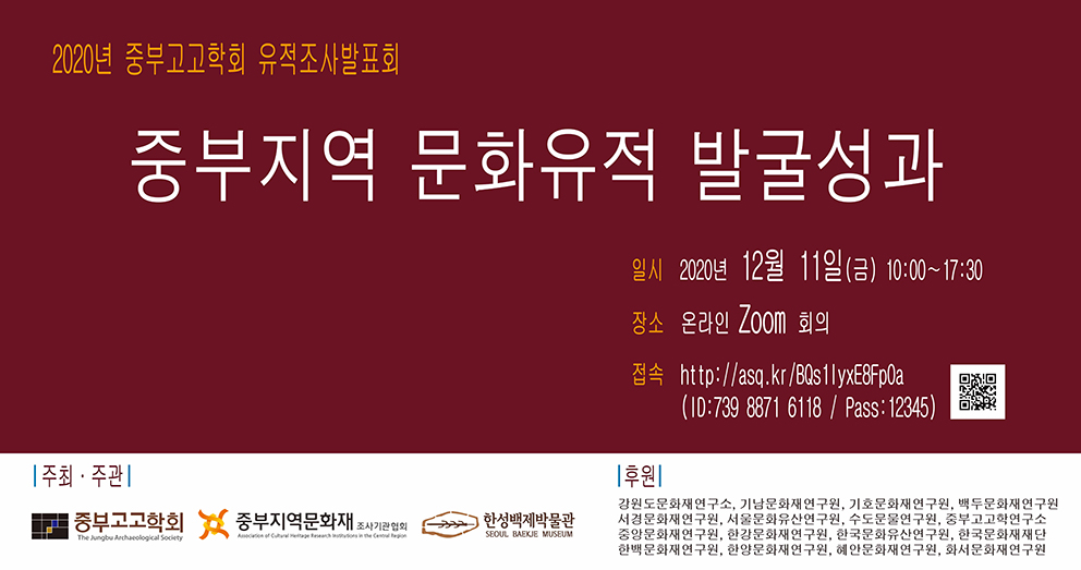 2020년 중부지역의 중요유적 발굴성과에 대한 여러 기관의 발표가 준비되어 있으니 회원 여러분의 많은 관심과 참여 부탁드립니다.