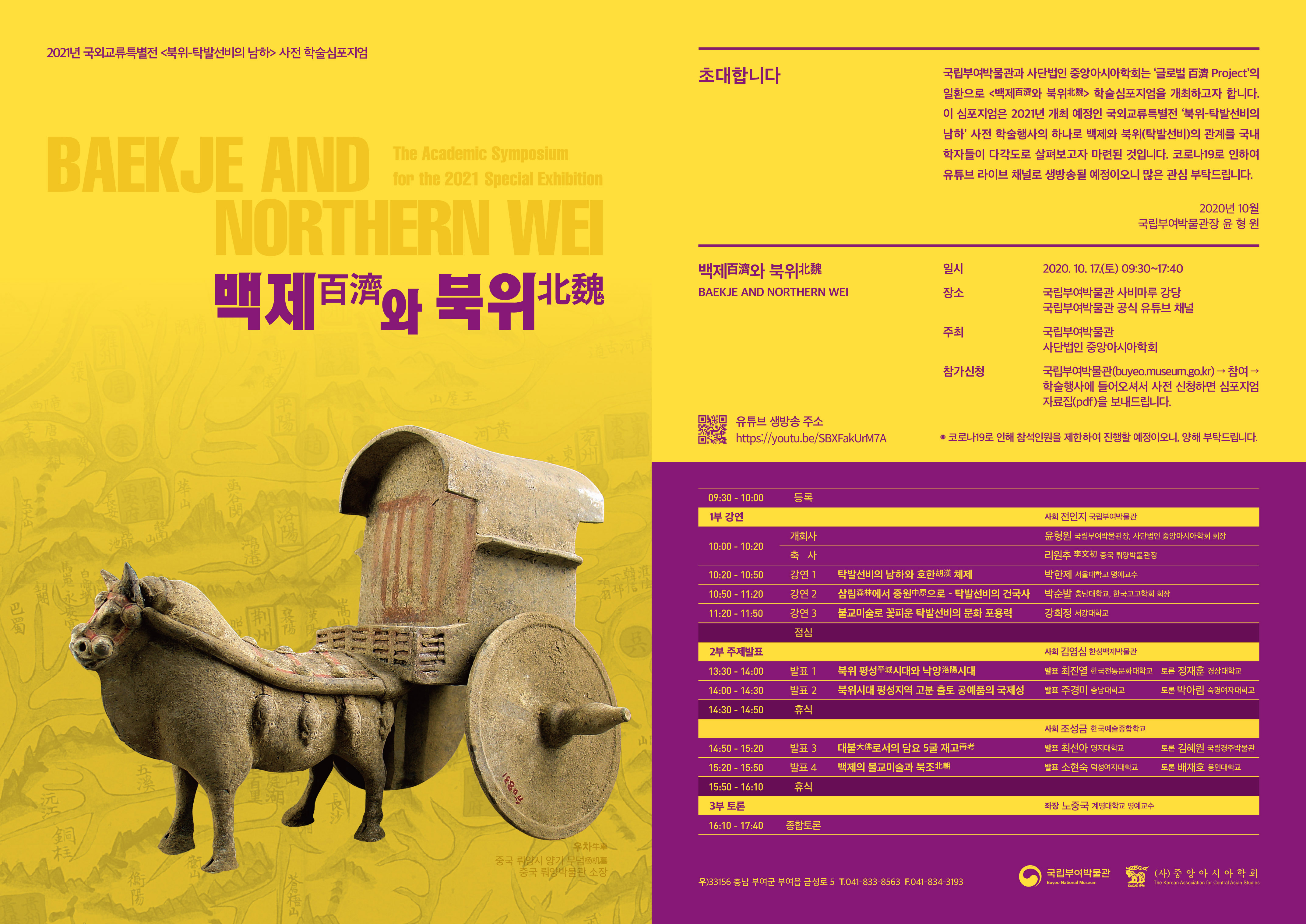 국립부여박물관과 사단법인 중앙아시아학회는 글로벌 백제 Project’의 일환으로 <백제(百濟)와 북위(北魏)> 학술 심포지엄을 개최하고자 합니다.