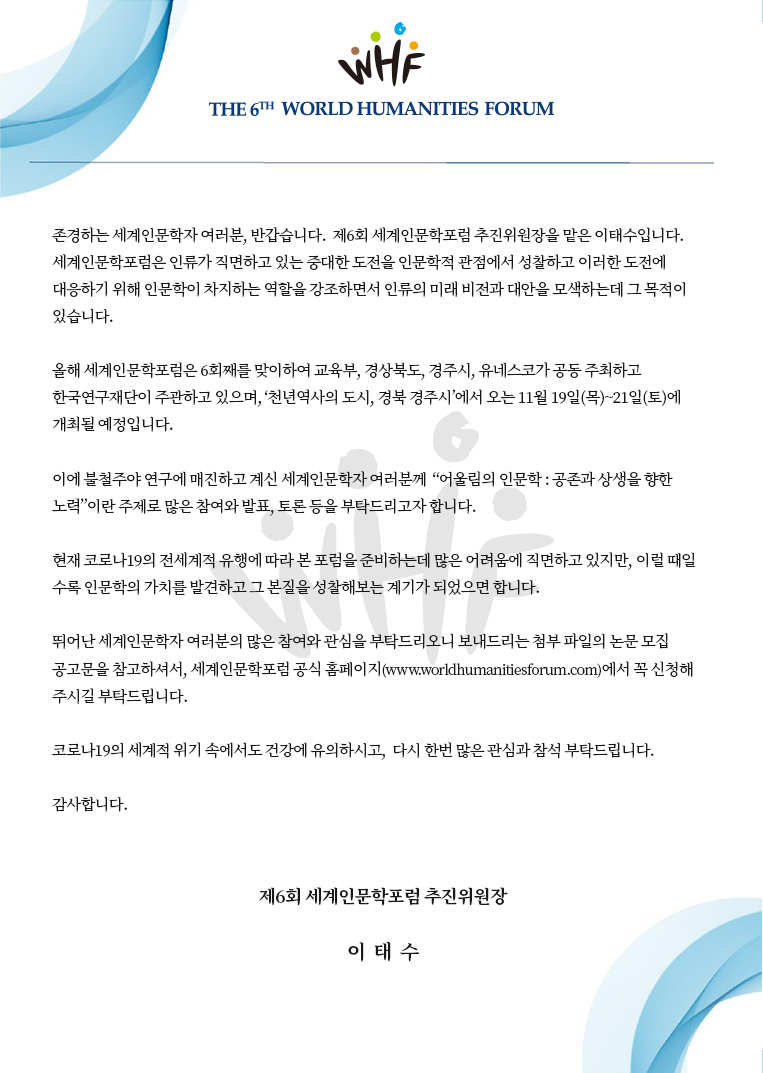 제6회 세계인문학포럼(WHF) 논문 모집 공고