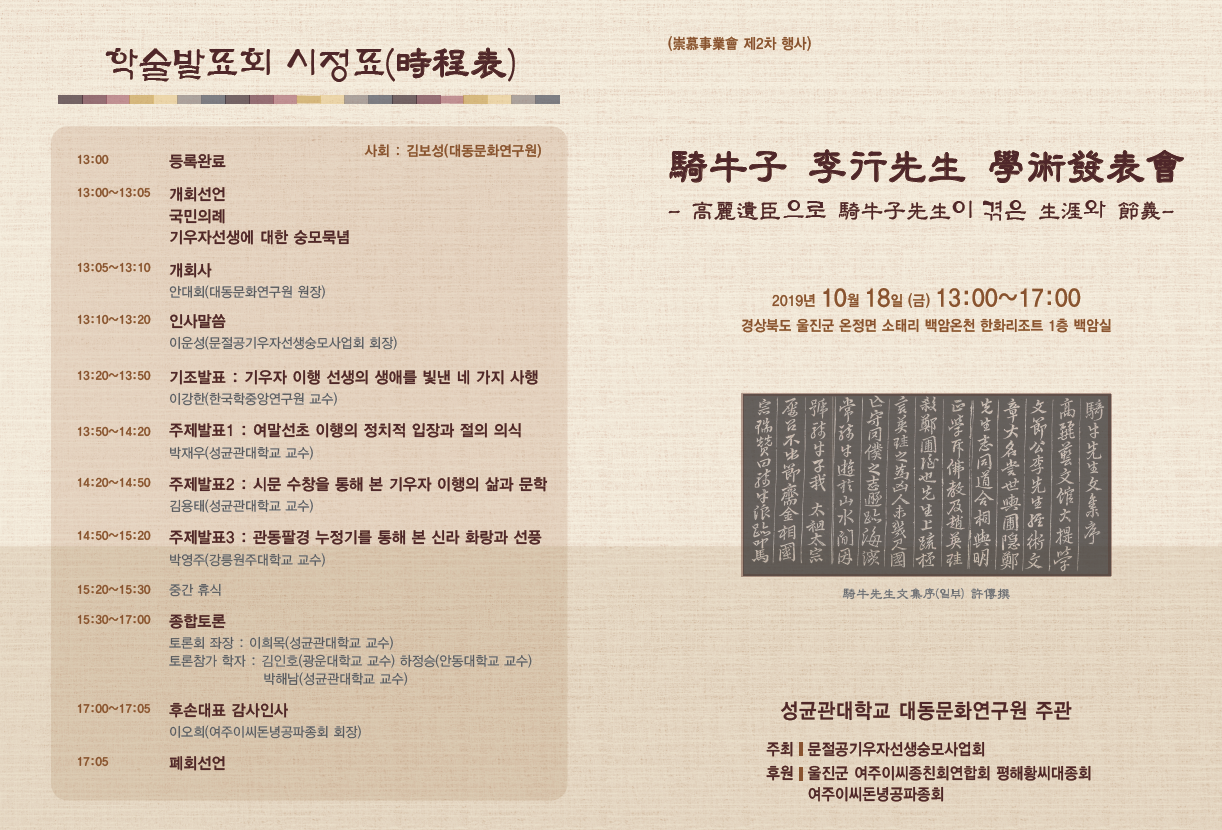 성균관대학교 대동문화연구원에서는 고려의 유신(遺臣)’ 기우자(騎牛子) 이행(李行) 선생이 남긴 발자취와 절의(節義)를 재조명하는 학술발표회를 개최합니다. 문절공기우자선생숭모사업회의 노력으로 경상북도 울진군 월송정에 기우자의 길이 상정되고 기우설비가 세워진 일을 기념하는 자리이기도 합니다. 이 뜻깊은 행사 뒤에 전문가의 학술 논의가 활발하게 이어지기를 기대합니다.